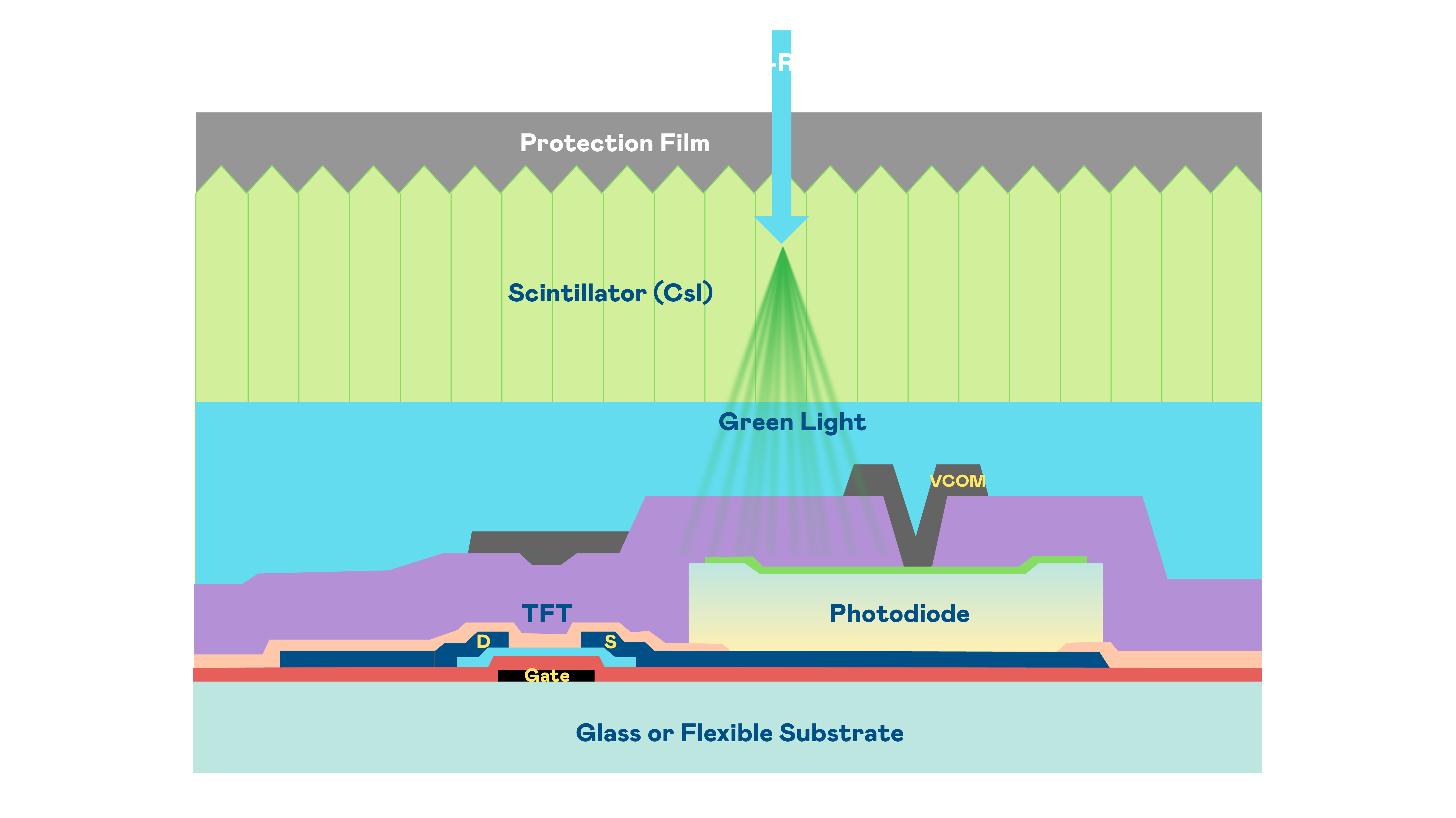 狮子会的X光影像感测阵列使用薄膜电晶体 (TFT) 作为每个像素的读取开关,搭配光电二极体(Photodiode)的光电转换元件,用以感测X光影像讯号。